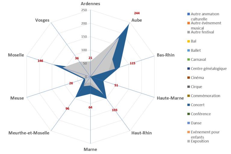 Animations culturelles par département à l'été 2023. Concerts et spectables en tête dans l'Aube. Avéré ou effet de recueil ?